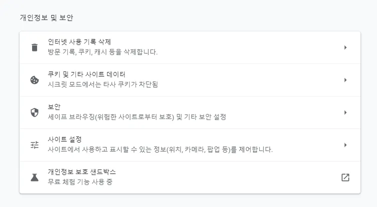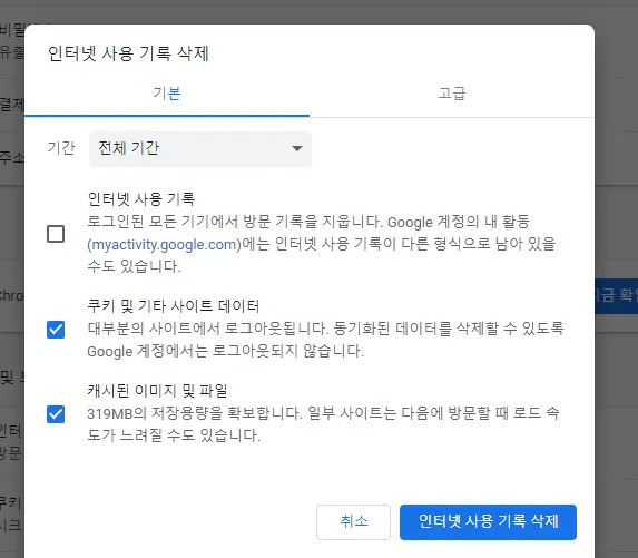 개인정보 및 보안 - 인터넷 사용 기록 삭제 - 쿠키 및 기타 사이트 데이터/캐시된 이미지 및 파일을 삭제해 주세요.