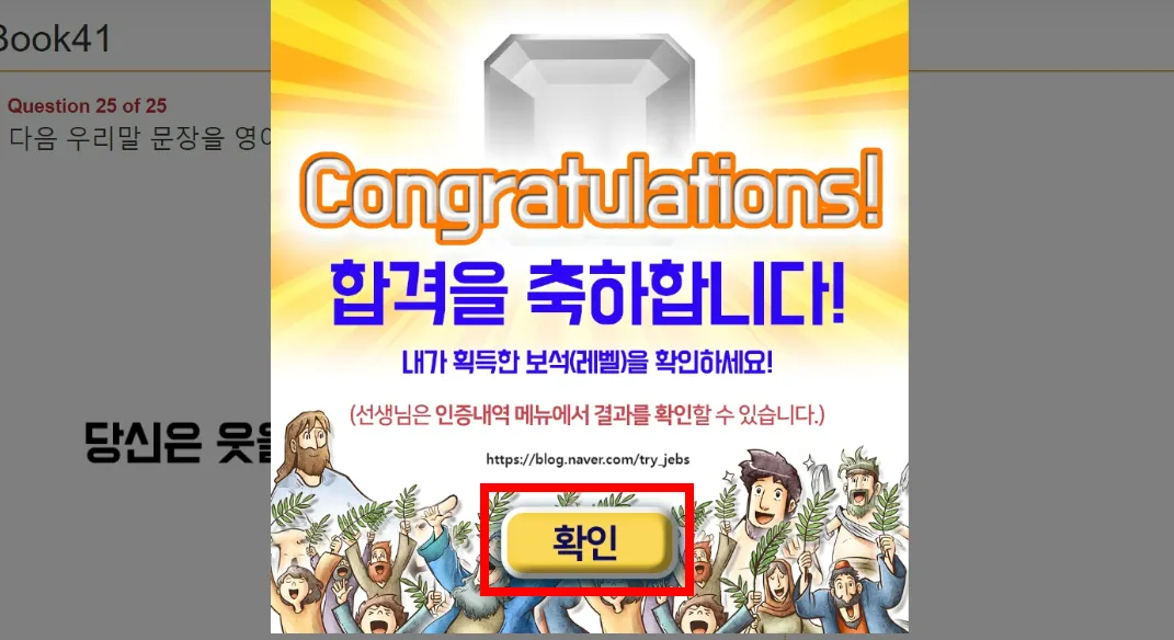 인증제 합격 후 반드시 [확인] 버튼을 눌러 인증제 화면을 종료해 주세요!