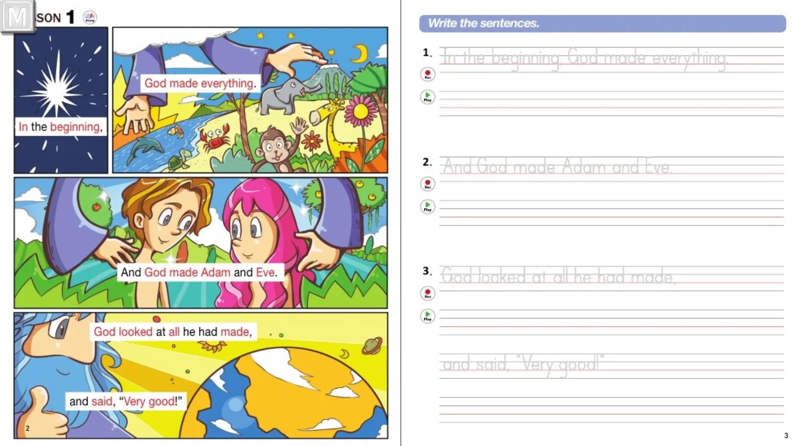삽화 옆 페이지에는 문장 따라쓰기를 할 수 있는 Writing 페이지가 있습니다.